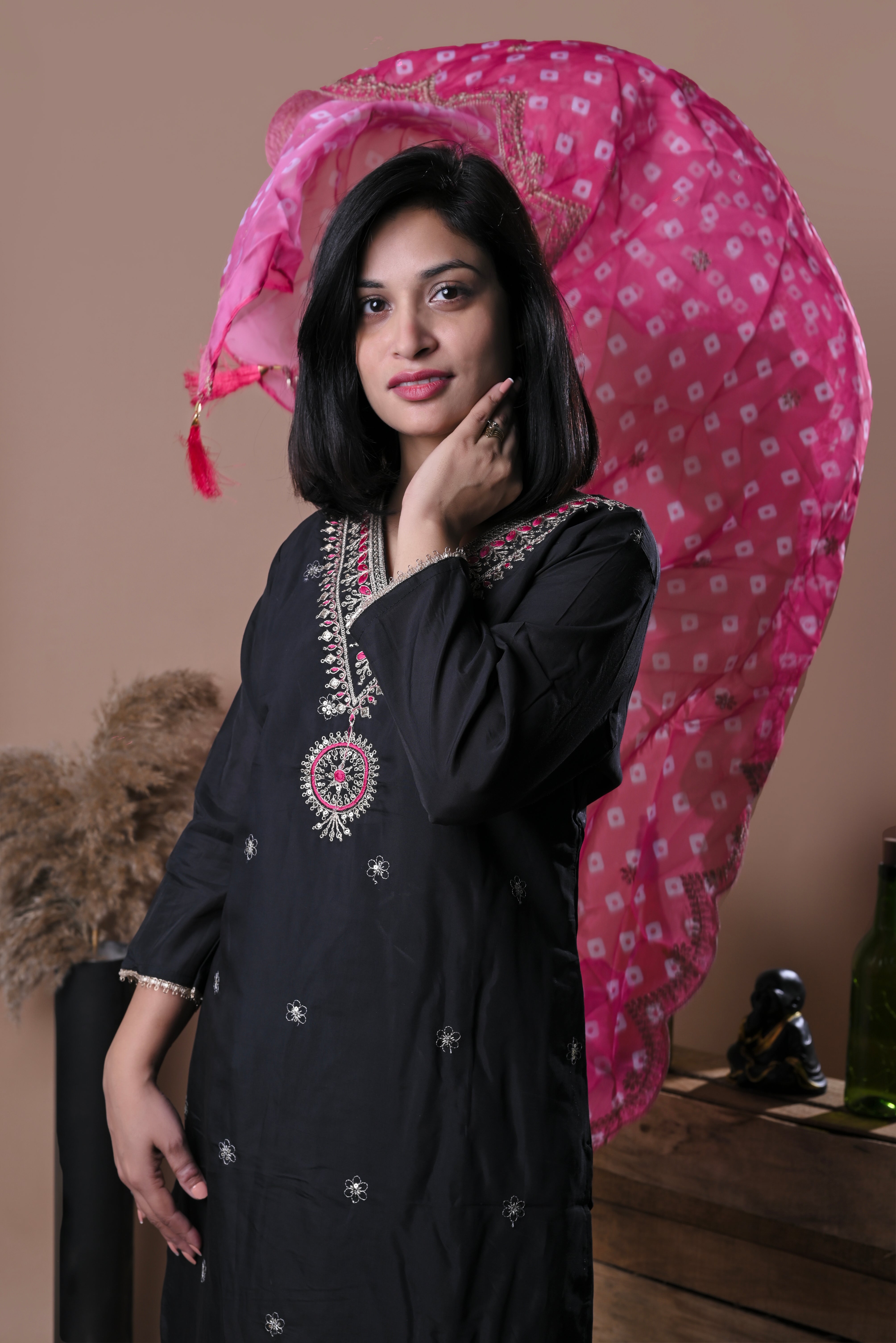 Multicolored embroidered sharara set. This set comes with a dupatta and kurta